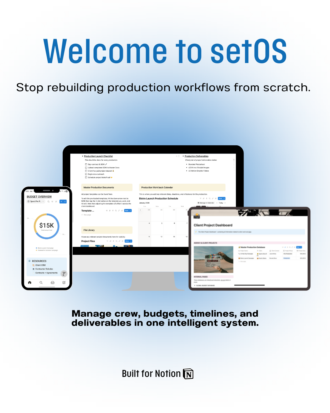 setOS is a Notion-based system designed to help creative teams and entrepreneurs plan, manage, and execute productions without the chaos of disconnected tools.